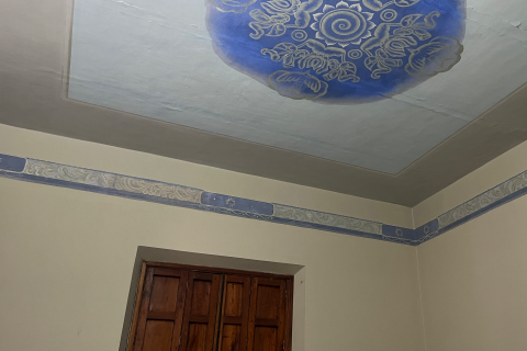 El espacio destaca por la pintura que recorre la parte superior de los muros y el techo. A manera de cenefa, una serie de motivos fitomorfos y zoomorfos —formas inspiradas en plantas y animales— rodea todo el perímetro del cuarto, creando un marco decorativo que envuelve la habitación. En el techo, estos elementos se organizan en una composición radial, generando un efecto visual que dirige la mirada hacia el centro del espacio.