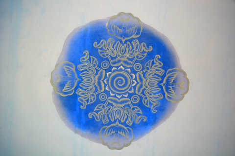 La paleta cromática está dominada por diferentes tonalidades de azul, acompañadas por detalles en blanco, amarillo y verdes grisáceos, lo que produce un ambiente sereno y armónico. Esta combinación de colores, junto con la delicadeza de los motivos ornamentales, da al espacio un carácter íntimo y distintivo dentro de la casa.