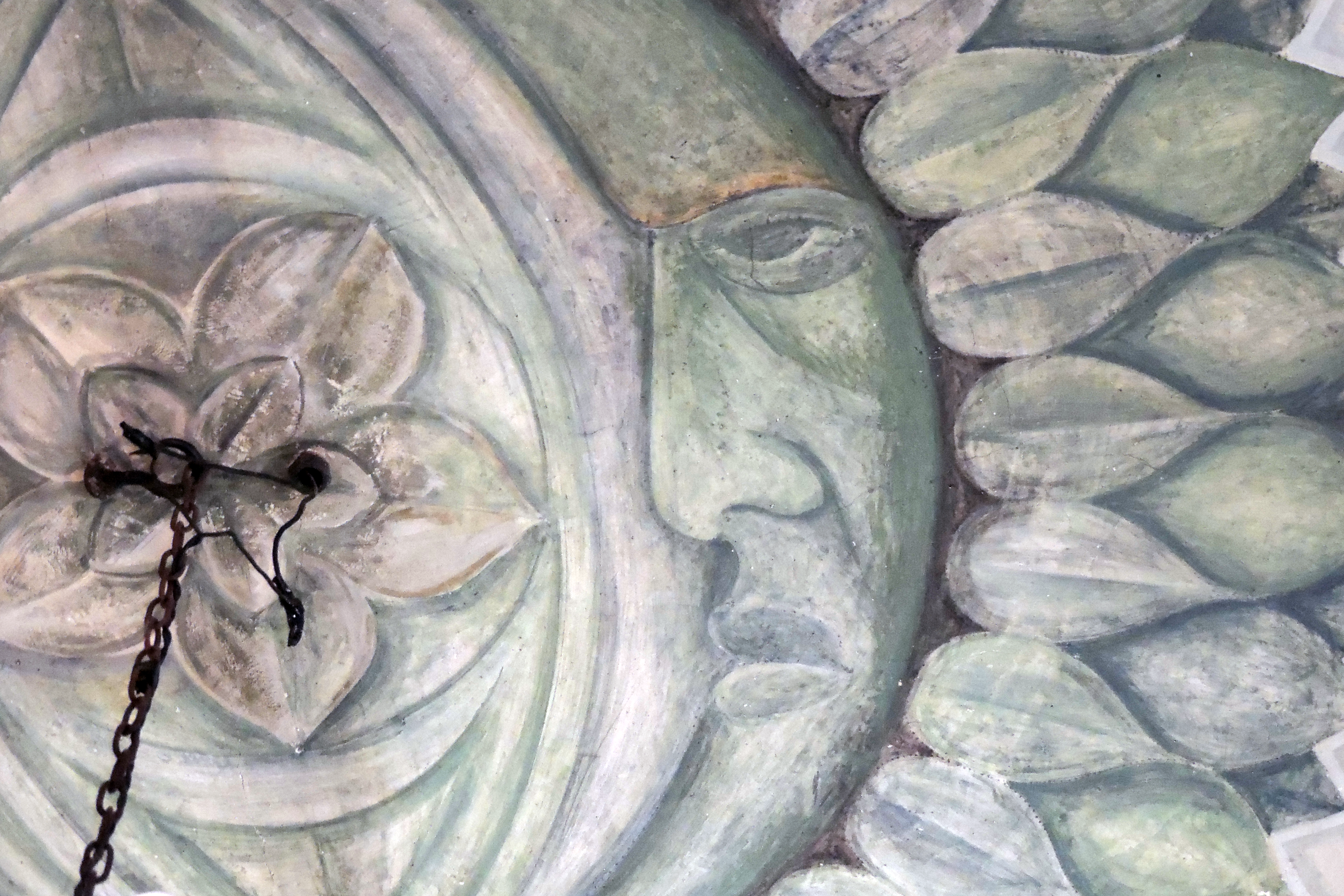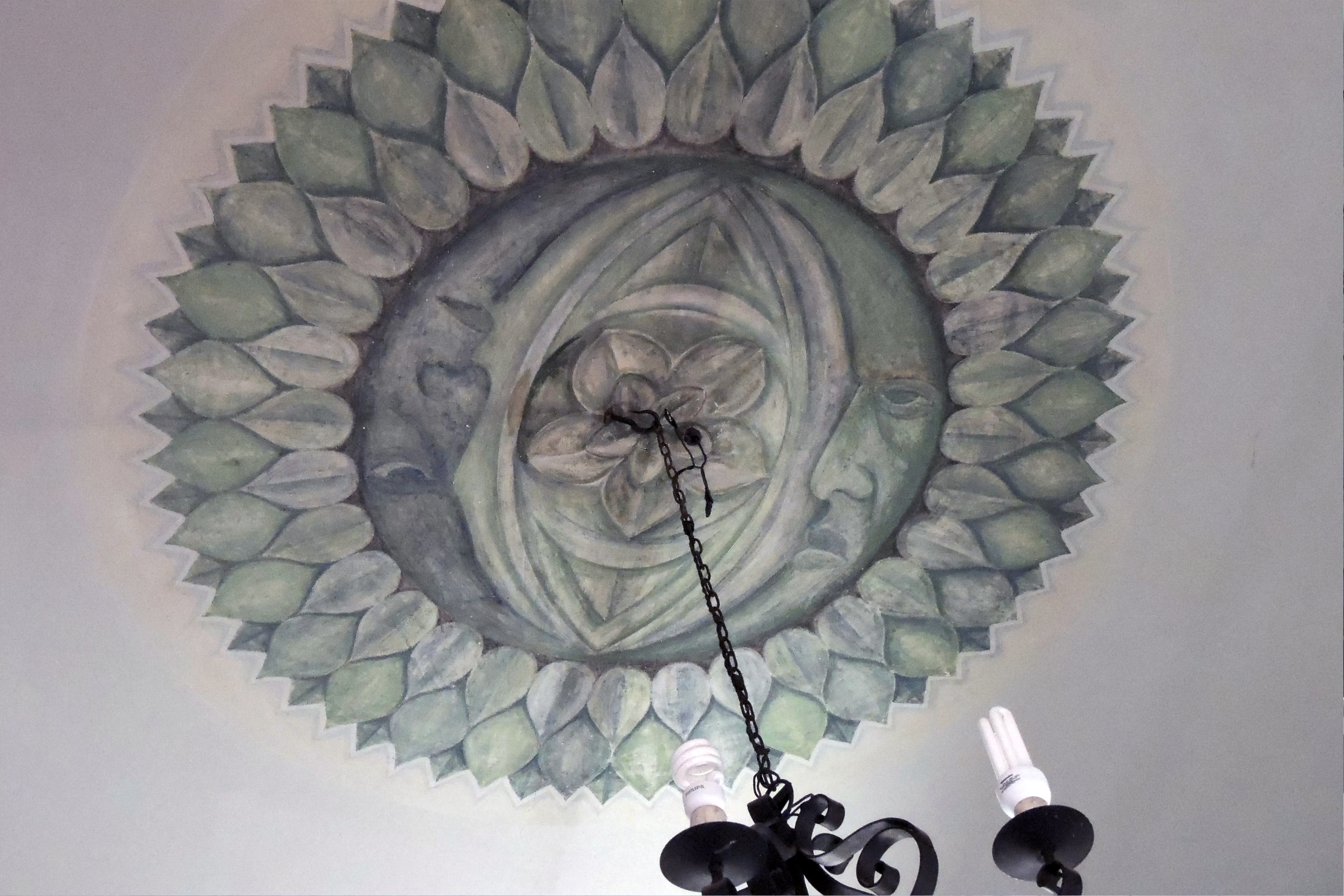 El programa decorativo se desarrolla principalmente en los muros y la bóveda. En el centro del techo destaca la representación de un par de lunas en cuarto creciente, integradas dentro de una composición simbólica que aporta dinamismo al espacio.