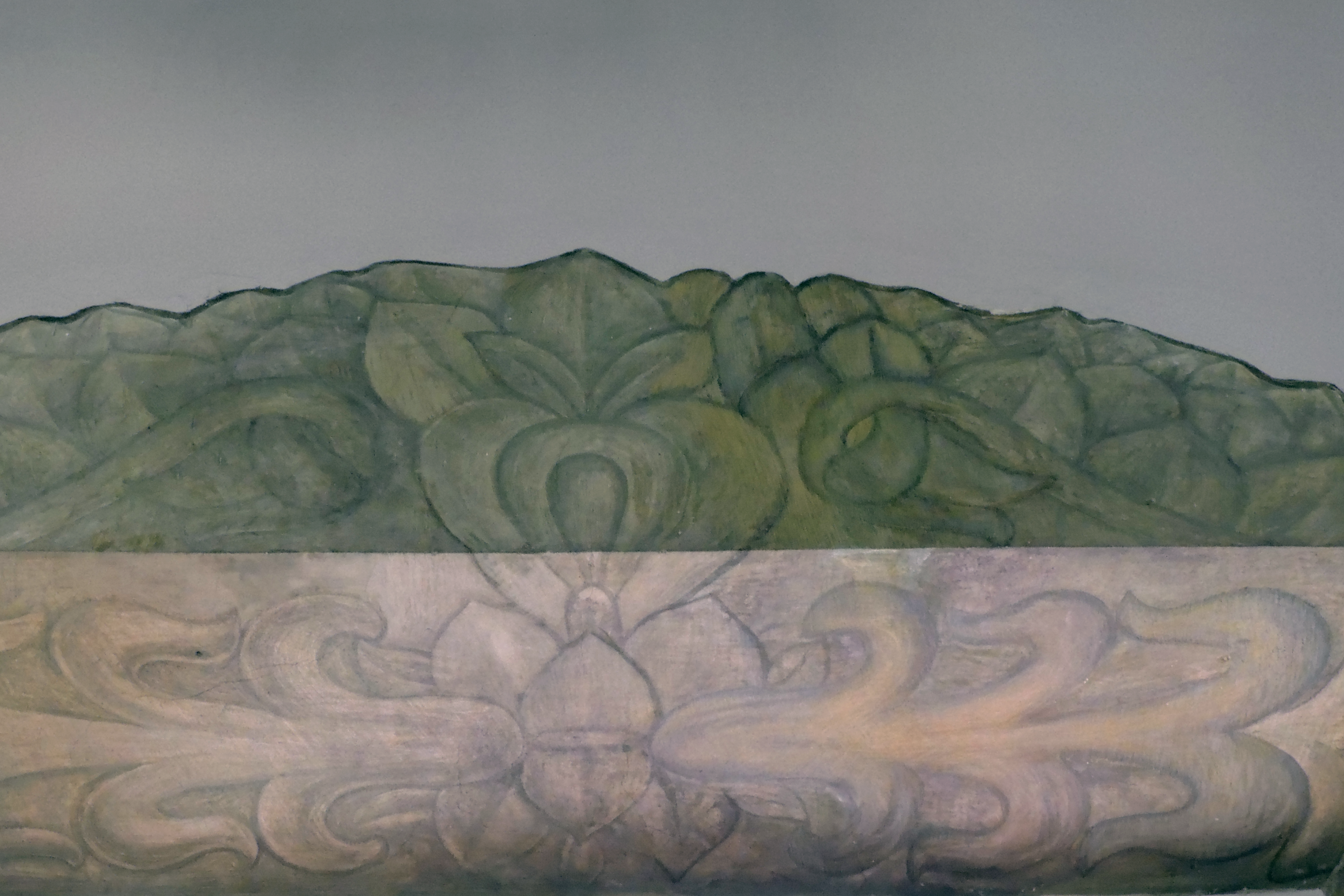 Este mismo diseño ornamental se repite en el muro de la ventana que da hacia el jardín, generando continuidad visual y reforzando la unidad del conjunto decorativo.
