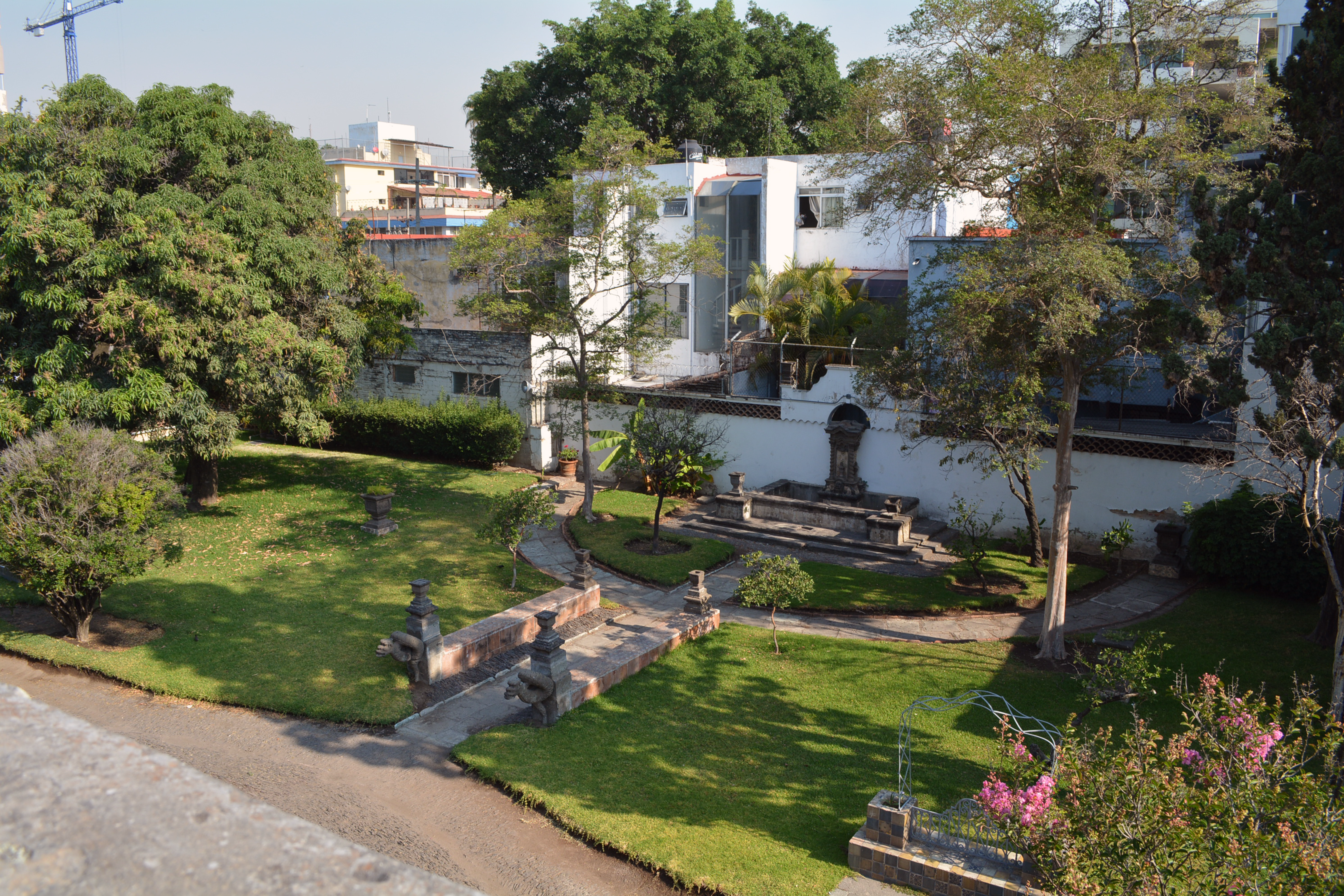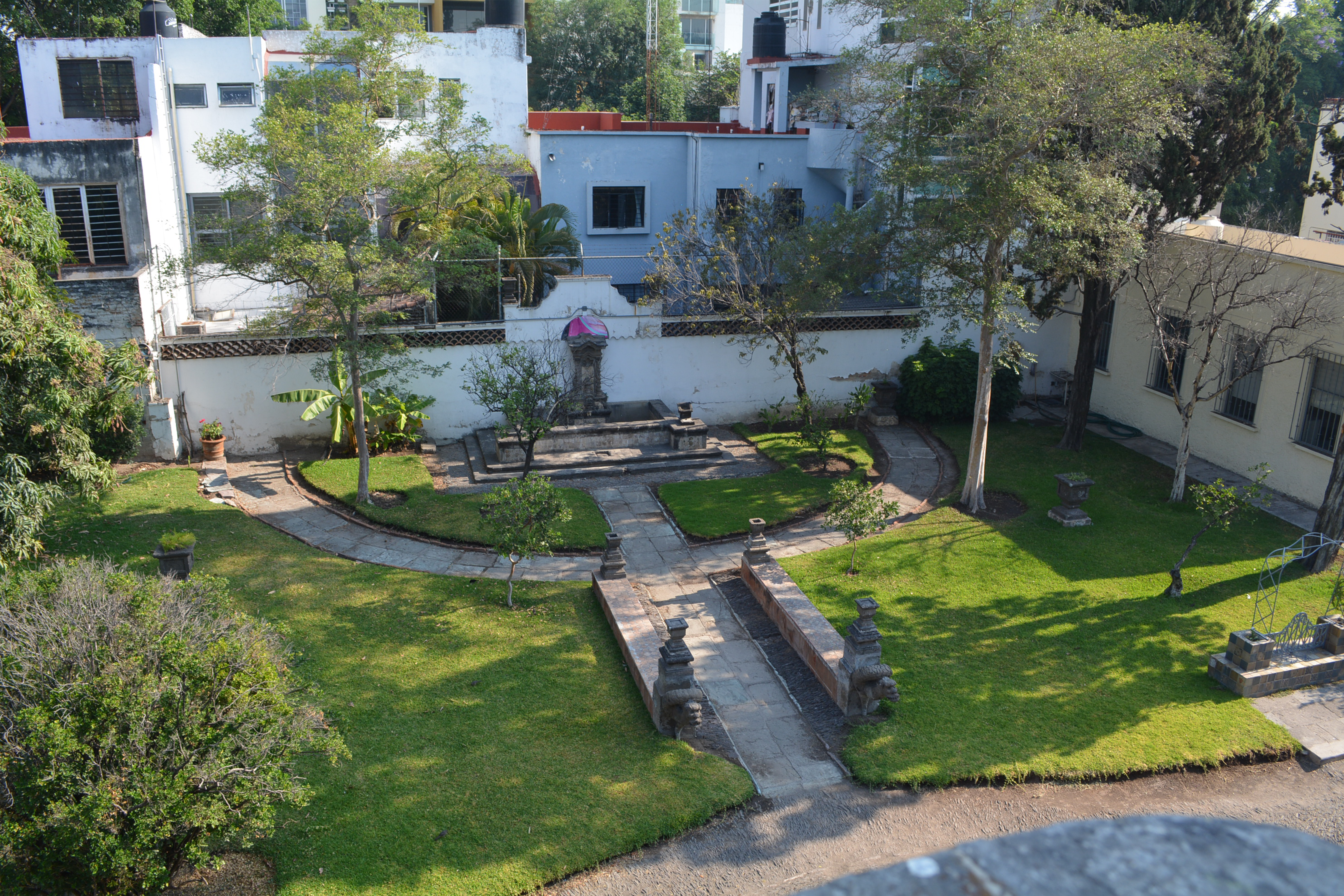 En la parte central del jardín, en medio de una especie de glorieta, sentada en un marco de pequeñas piedras de colores, ahogadas en el piso formado figuras indígenas, se encuentra la fuente de plana cuadrada, un basamento con motivos zoomorfos de donde se desplanta una especie de ciborio en cantera; la cual fue diseñada por Amado de la Cueva y Xavier Guerrero. De ella partían hacía los cuatro puntos cardinales igual número de callecillas de cantera que trascendían los jardines.